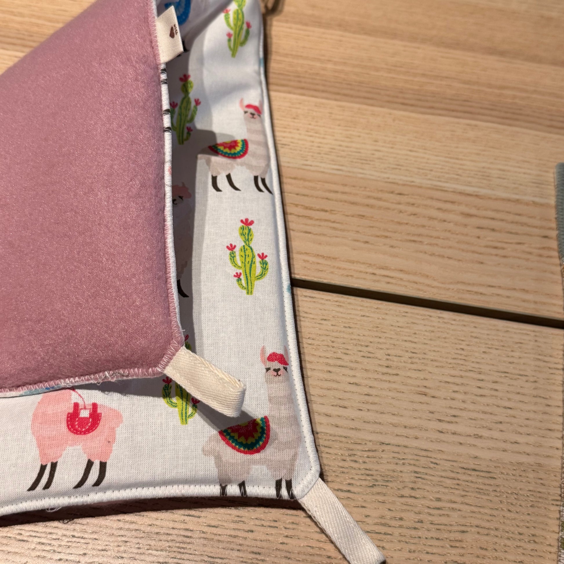 Diese Hängematte für Meerschweinchen und Kleintiere besteht aus einer Baumwoll- und einer Fleeceseite und ist mit Volumenvlies gefüttert. Die Baumwollseite ist super für den Sommer geeignet. Die Kanten sind rundherum mit einer Ziernaht versehen. Die Schlaufen sind doppelt vernäht.